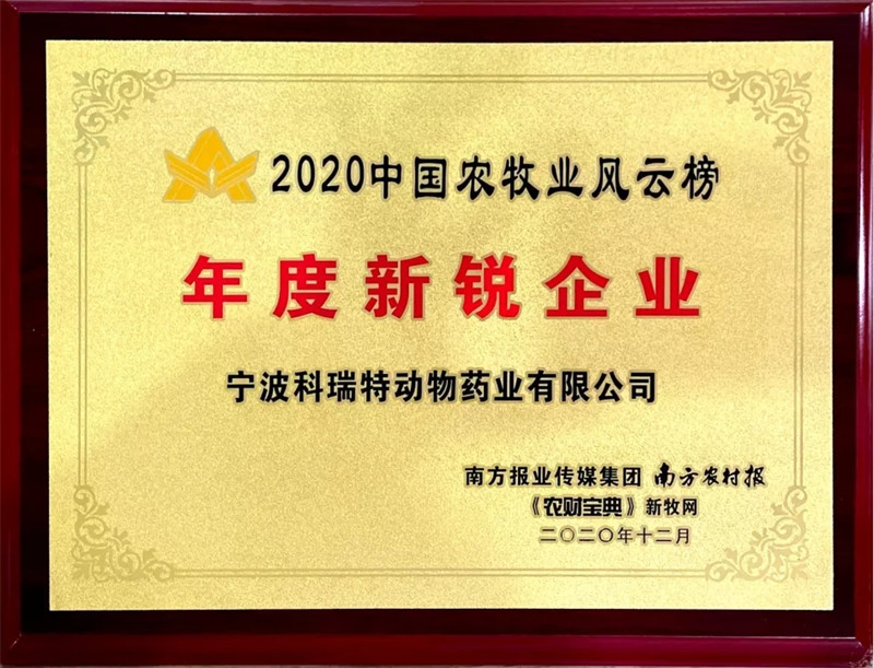 2020年12月11日,由南方報業(yè)傳媒集團、南方農村報社、廣東省鄉(xiāng)村振興文化服務產業(yè)園主辦,農財寶典、新牧網、牛羊寶典承辦的中成藥業(yè)特約?2020第十屆中國農牧業(yè)風云會在廣州盛大舉行。經過前期激烈的網絡投票,以及專家、金牌服務商、協(xié)會、種豬場評委綜合評選,寧波科瑞特動物藥業(yè)有限公司當選2020年中國農牧業(yè)風云榜“年度新銳企業(yè)”。