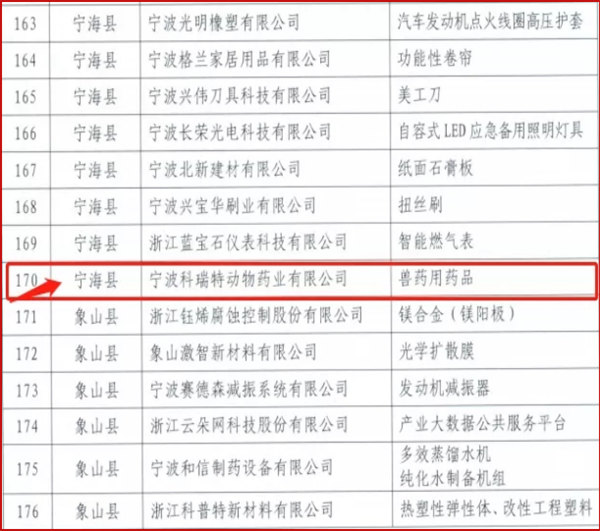 近日,根據(jù)《關(guān)于組織推薦2021年度寧波市專精特新“小巨人”企業(yè)申報(bào)認(rèn)定工作的通知》(甬經(jīng)信中小〔2021〕40號(hào))在各區(qū)縣(市)、管委會(huì)經(jīng)信部門申報(bào)、初核和推薦的基礎(chǔ)上,經(jīng)組織專家評(píng)審及網(wǎng)上公示等程序,寧波市經(jīng)濟(jì)和信息化局公布《2021年寧波市專精特新“小巨人”企業(yè)名單的通知》,熱烈祝賀寧波科瑞特動(dòng)物藥業(yè)有限公司榮幸入